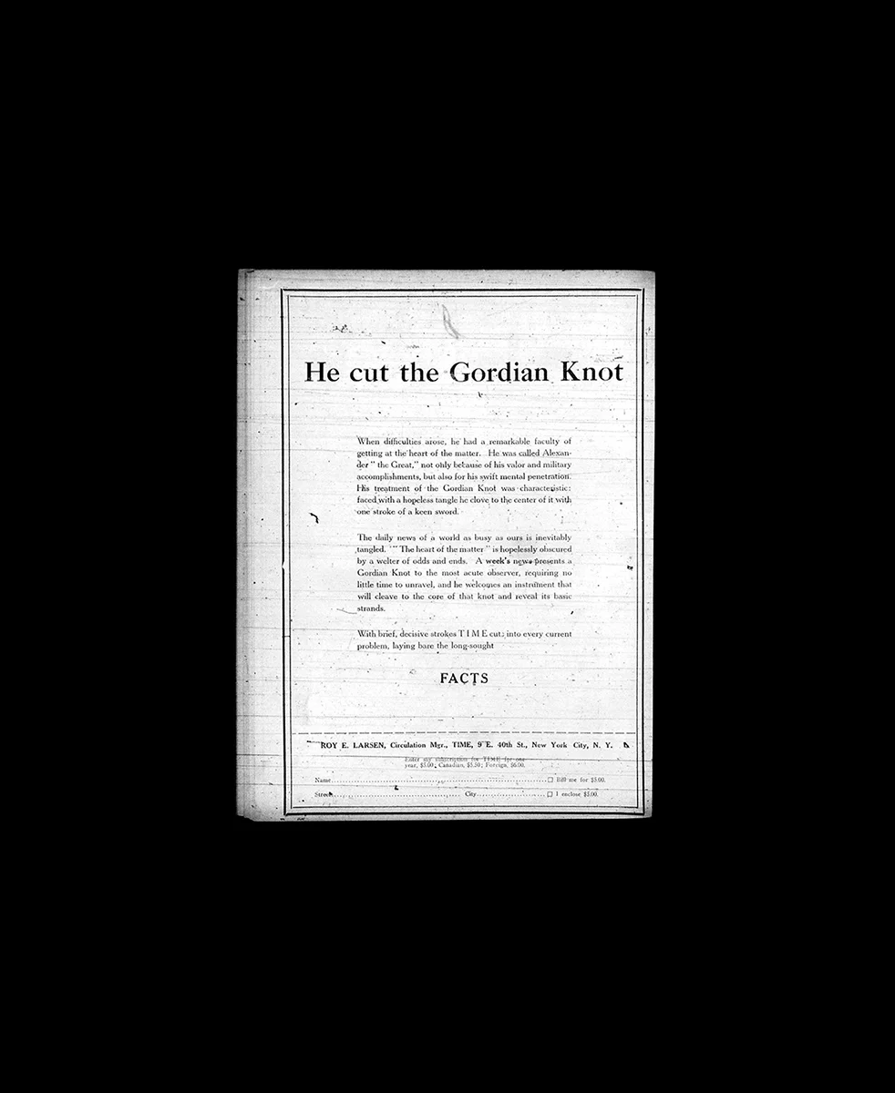 In 1923, co-founders Briton Hadden and Henry Luce created TIME magazine, the first weekly news magazine in the United States. Unlike the daily newspapers at that time, TIME prioritized accurate reporting over speed of distribution—TIME was initially called FACTS magazine. Curious about the first fact-checked news, I read every issue of TIME from its first year of publication. Confirmed, reliable facts was the magazine’s primary product, and TIME promoted its innovation through advertisements within its own pages.